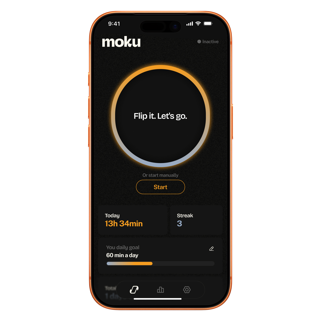 The mechanic is as simple as it sounds: flip your iPhone face down on a table, a desk, your lap — anywhere. Moku's motion sensors detect it, a session begins, and every minute you stay off your phone is a minute reclaimed.